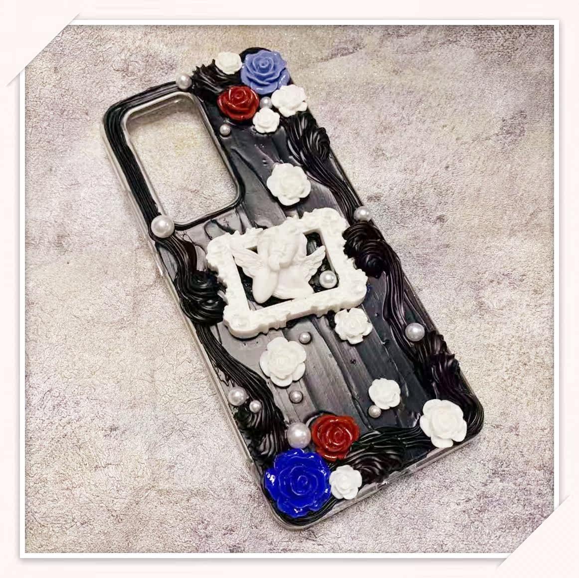 复古天使黑色玫瑰花奶油胶手机壳适用于苹果华为小米安卓三星折叠热门设计联盟服务商