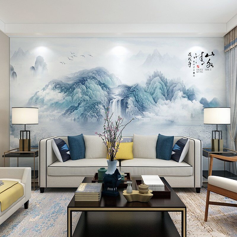 3d电视背景墙壁纸中式山水意境客厅影视墙壁画8d卧室沙发装饰墙。热门设计联盟服务商