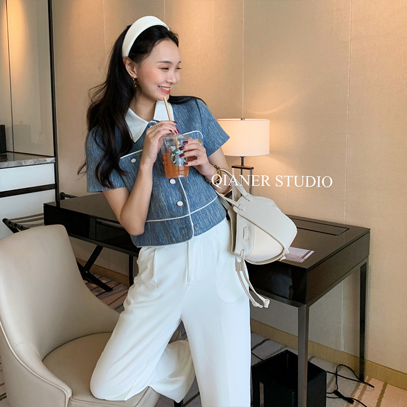 小香短袖上衣 Polo领高定重工设计感编织蓝格温柔穿搭夏季女短款热门设计联盟服务商